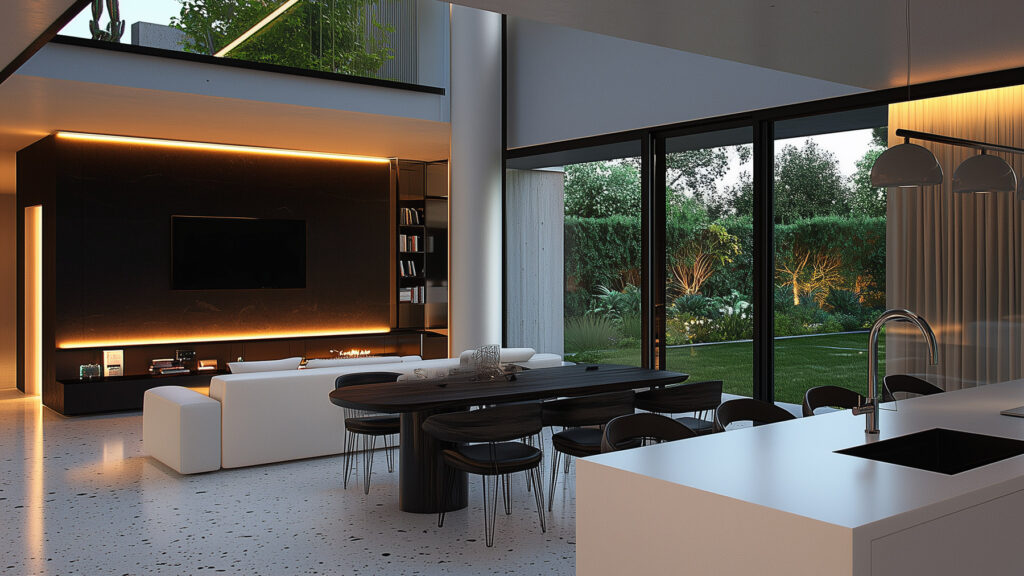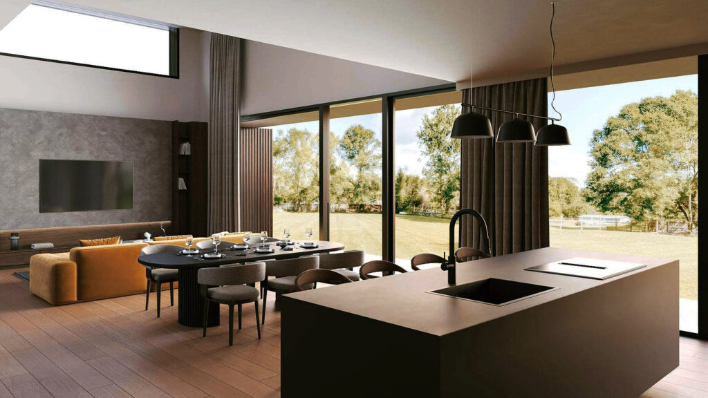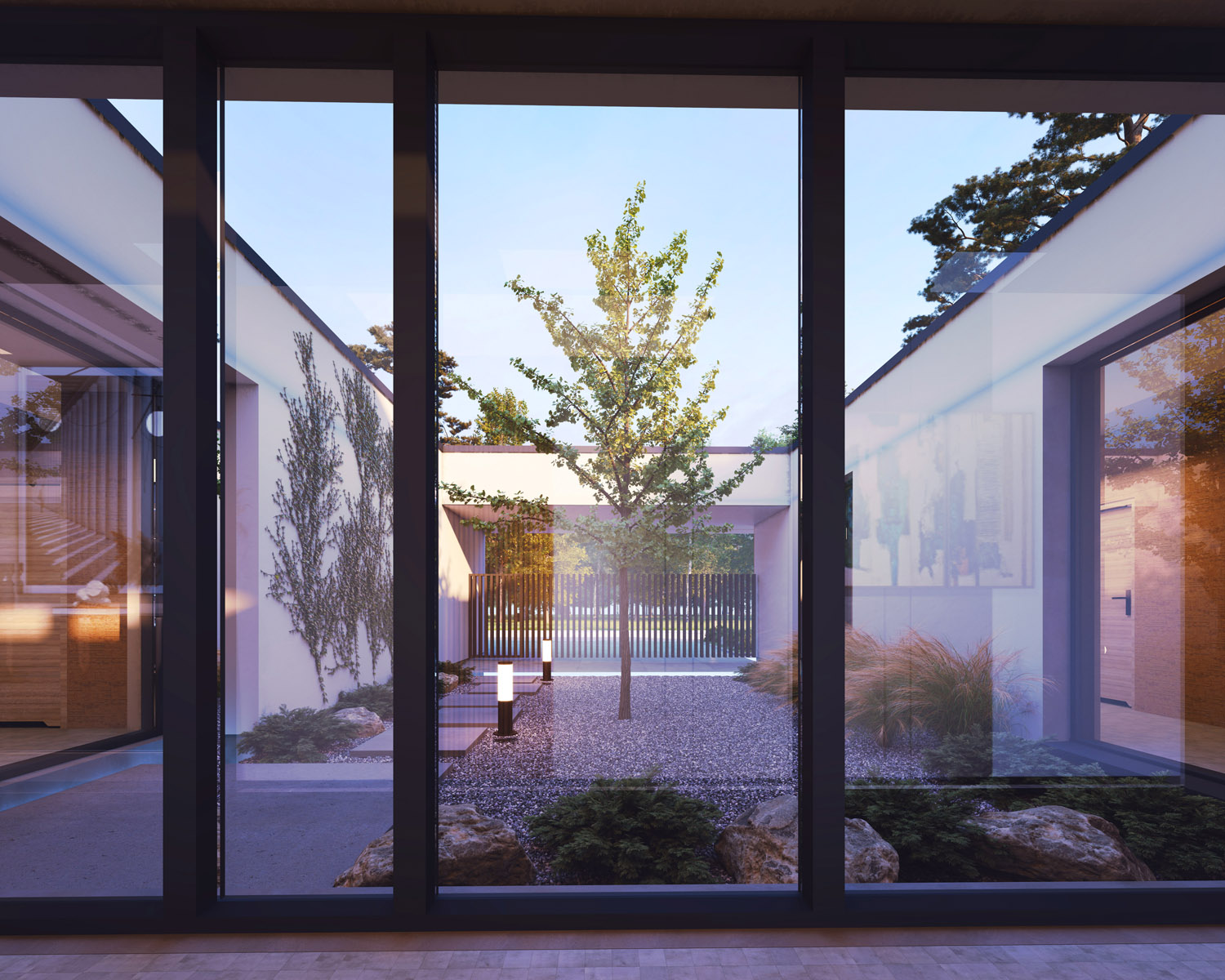 To przestronny, jasny salon połączony z elegancką jadalnią i funkcjonalną kuchnia, tworząc otwartą i przyjezdną przestrzeń do wspólnego spędzania czasu . Dzięki dużym panoramicznym przeszkleniom przestrzeń ta otwiera się zarówno na patio jak i na duży ogród który stanowi przedłużenie strefy dziennej . Reprezentacyjny charakter tej części domu podkreśla podwyższony sufit, który potęguje wrażenie przestronności.